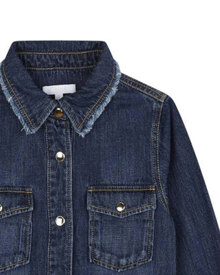 Camicia bimbo in cotone con coletto classico, chiusura anteriore con bottoni, taschini applicati sul petto. Tessuto effetto denim.