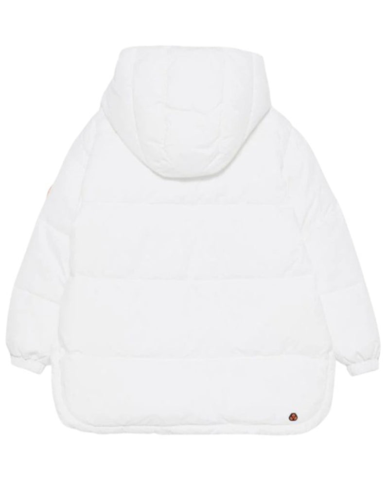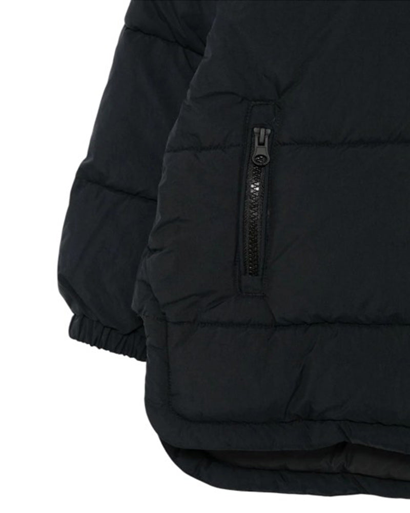 Giubbino imbottito da bambina effetto opaco. Presenta design trapuntato, cappuccio fisso, maniche lunghe con polsi elasticizzati, chiusura frontale con zip, due tasche frontali a filo con zip, orlo svasato. È decorato con patch logo applicata sulla manica.