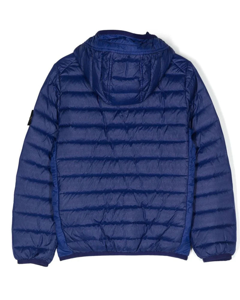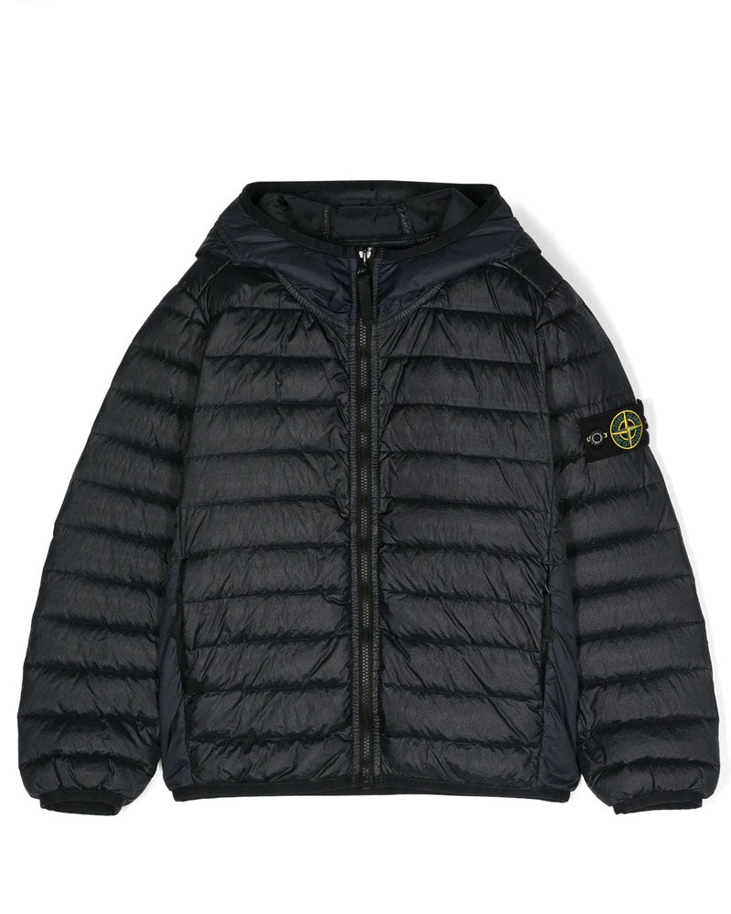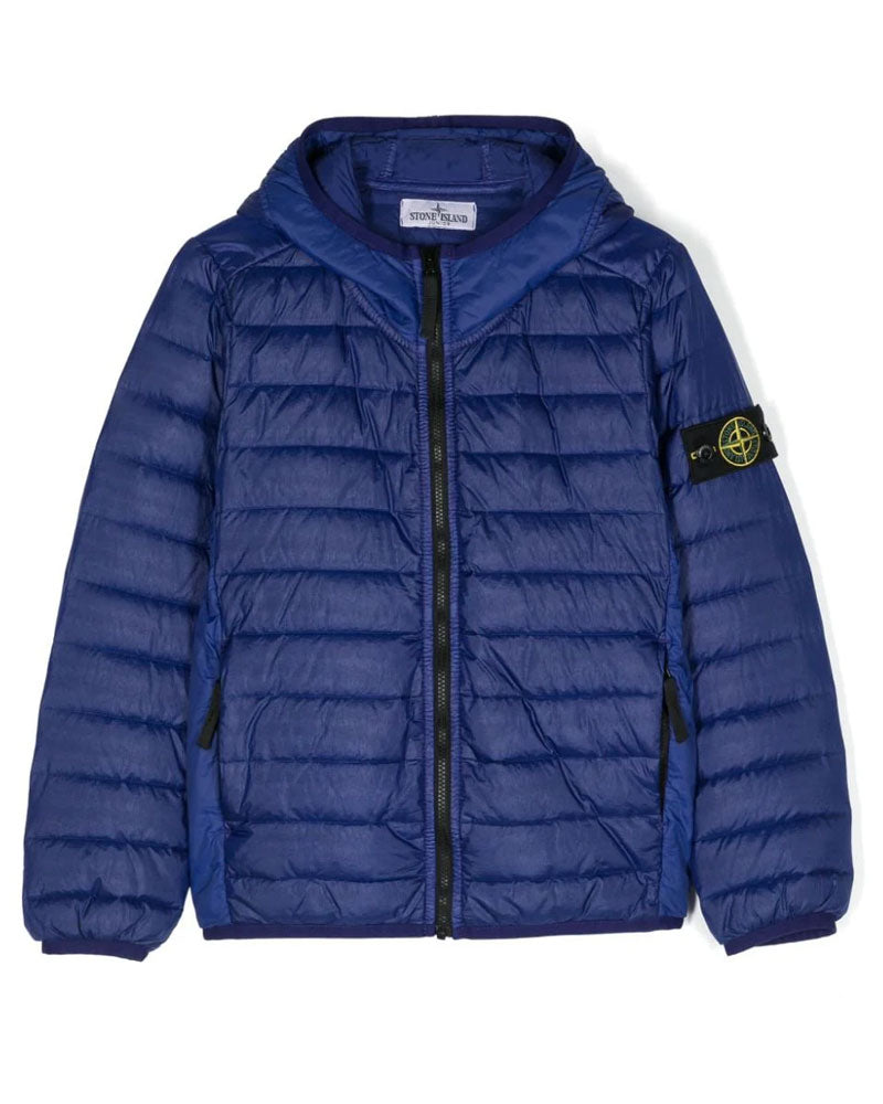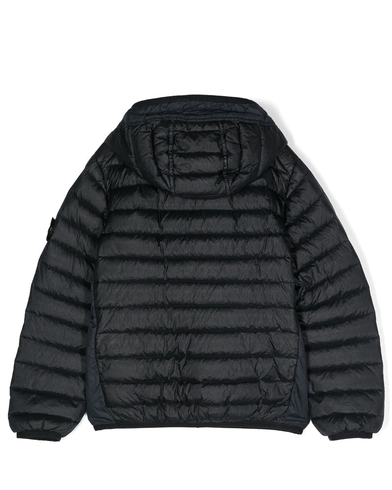 Giubbino 100 grammi Stone Island, realizzato in nylon croccante riciclato. Modello con imbottitura in piuma, chiusura con zip, cappuccio e logo sulla manica. Collo, polsi e fondo bordati in fettuccia elasticizzata. Tasche in piedi chiuse da zip.