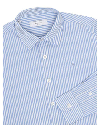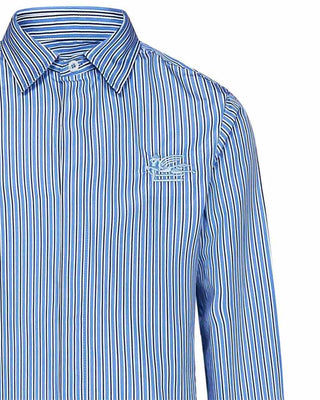 Camicia realizzata in popeline di cotone da bambino. Presenta fantasia a righe all-over, colletto a punta, chiusura frontale con bottoni, maniche lunghe con bottoni ai polsi. È decorata con logo ricamato sul petto.