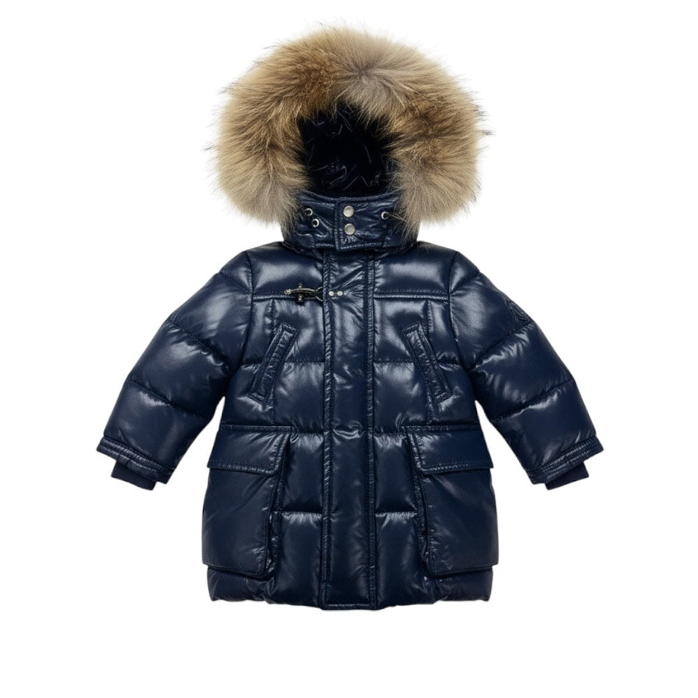 Giubbino imbottito da neonato, realizzato in nylon laqué. Presenta design trapuntato, cappuccio rimovibile con bordo in pelliccia di procione, chiusura frontale con zip e bottoni a pressione, maniche lunghe con polsini a coste, due tasche a filetto e due tasche con patta applicate sul davanti. È decorato con logo ricamato sulla manica.