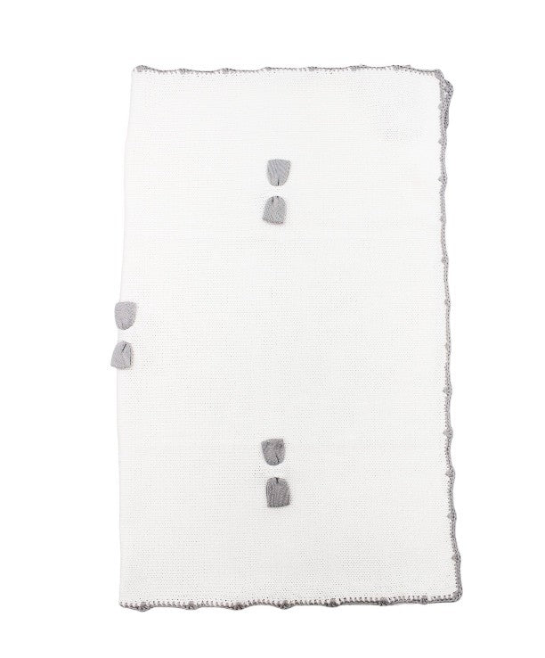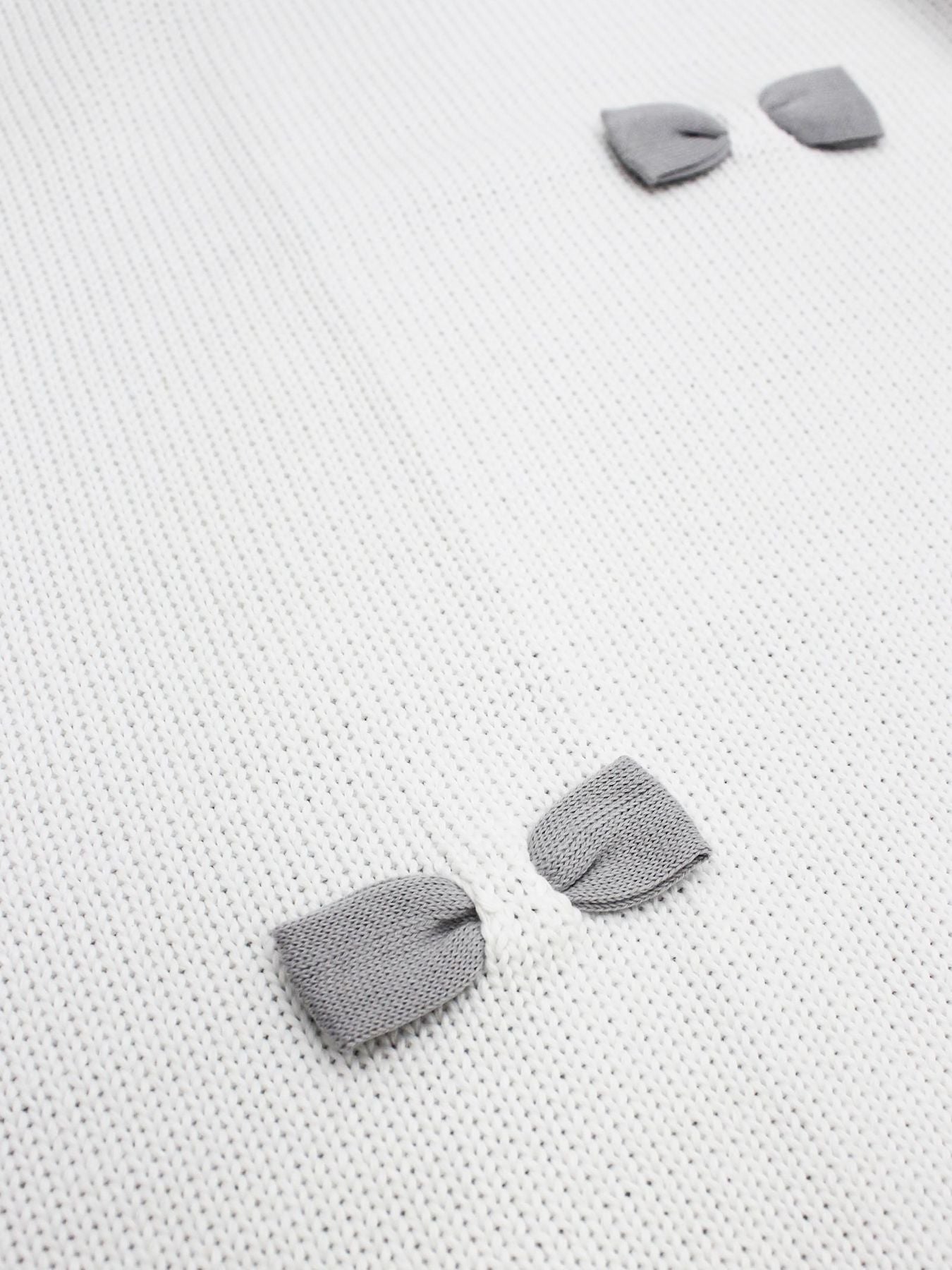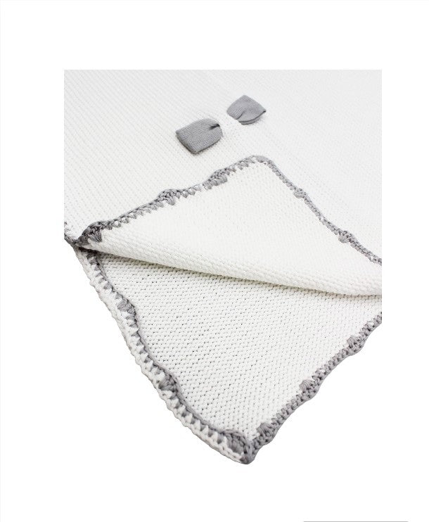 Little Bear newborn blanket in white thread with grey border and bows.
