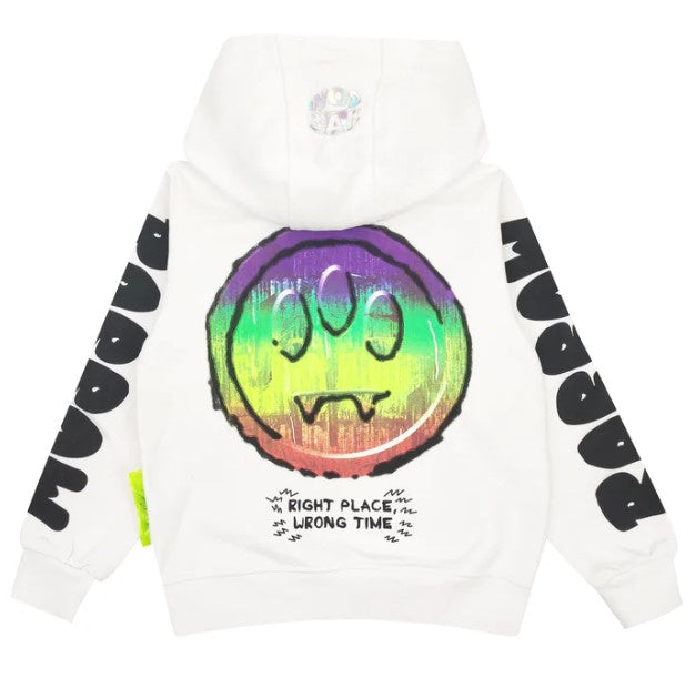 Long sleeve hoodie, logo and symbol print on the front and back, ribbed hem and cuffs.