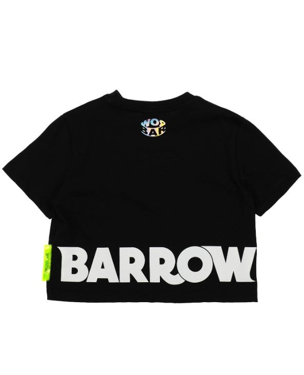 Crew neck, short sleeve, cropped T-shirt. Logo print on the front.