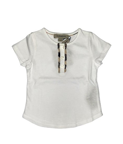 Crew neck T-shirt with button fastening, classic check ruches on the front.