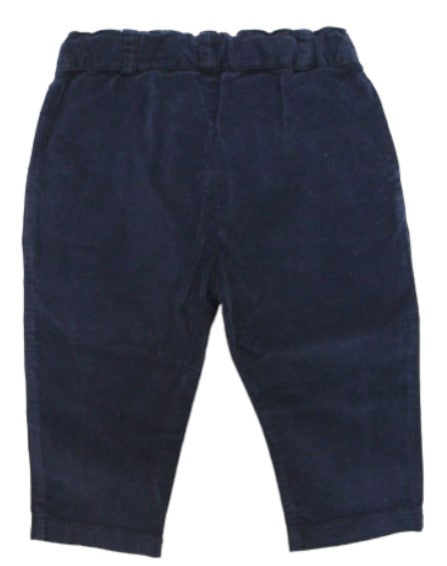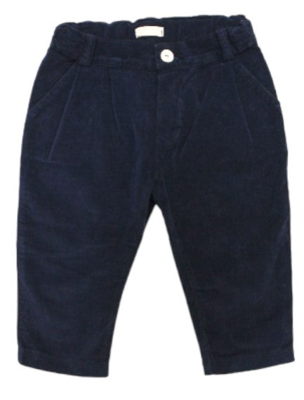 Trousers with pleats, elastic waist, American pocket, five-pocket style, button fastening.