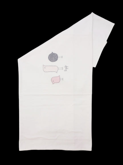 The Owl Baby Blanket in white with small central birds sewn in grey and pink.