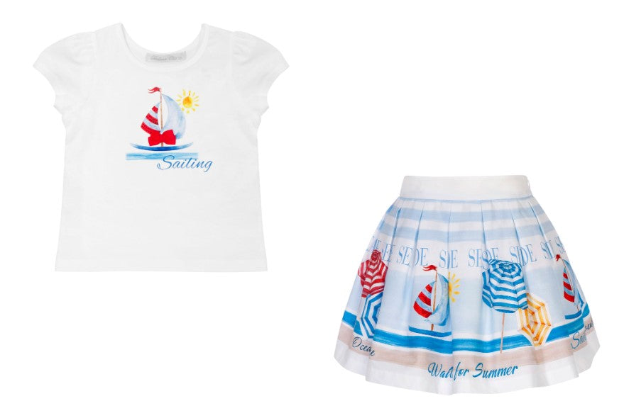 Complete with wide patterned skirt, bodice with zip closure and short-sleeved crew neck t-shirt with print.