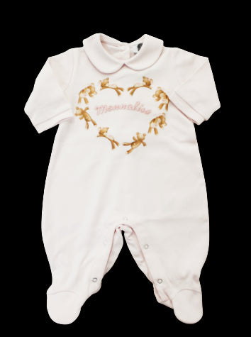 Monnalisa babygrow with heart-shaped teddy bear print.