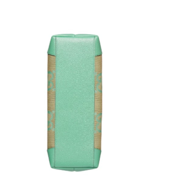 Aqua green, beige, canvas, signature Double G logo, Jumbo GG canvas, signature Double G logo, two flat handles, single compartment, interior zip pocket and interior card slot.