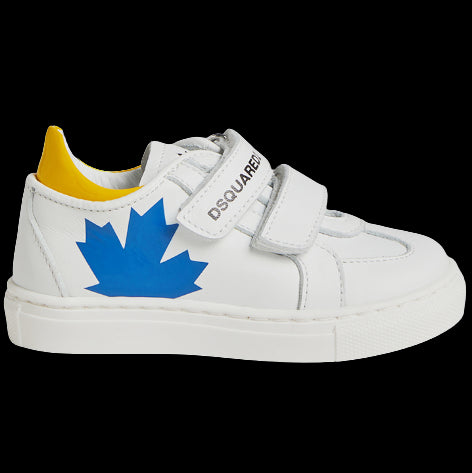 Dsquared2 sneakers with iconic side leaf and yellow patent leather detail on the back.