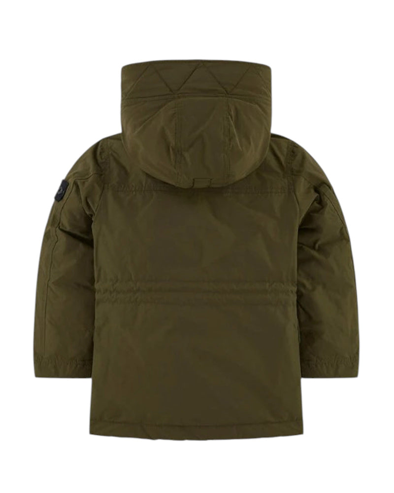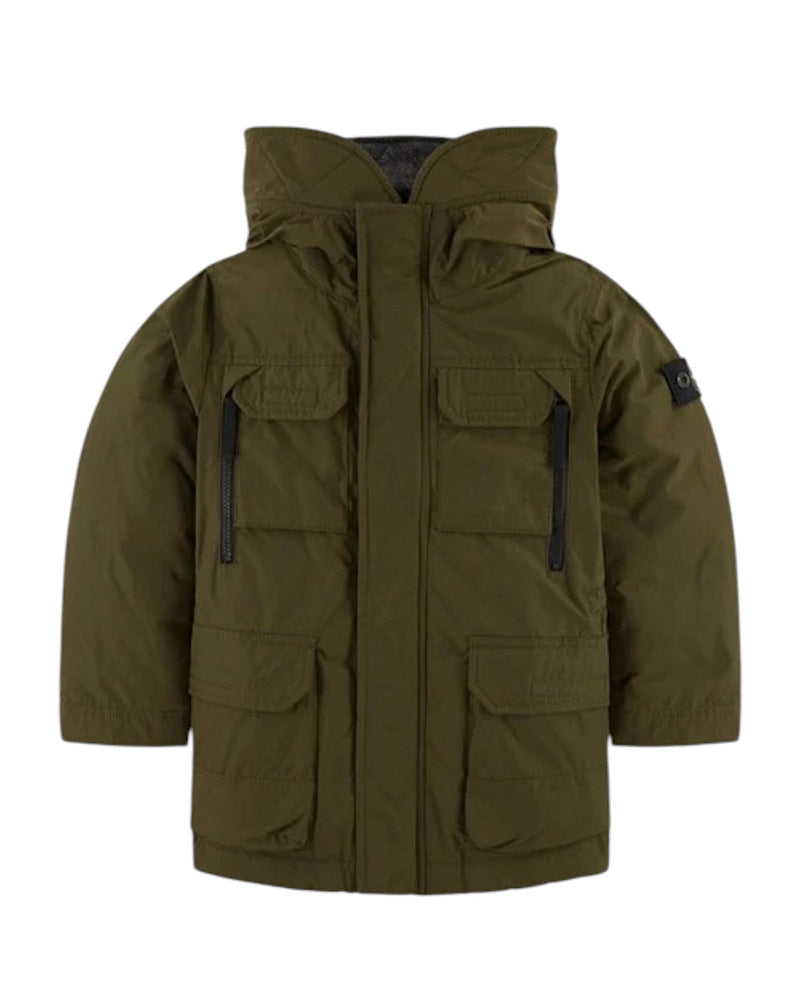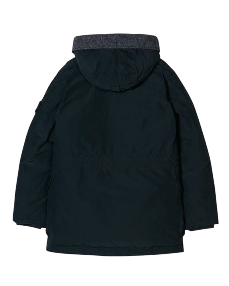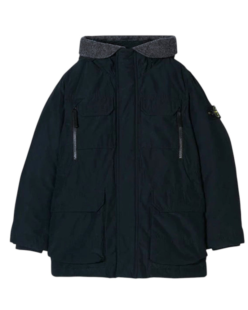 Long jacket, fixed hood, zip fastening, applied symbol.
