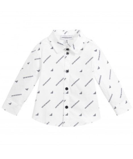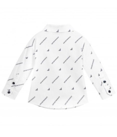 Long-sleeved baby shirt with classic collar. All-over printed logo. Front button closure.