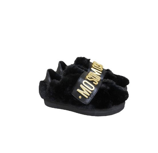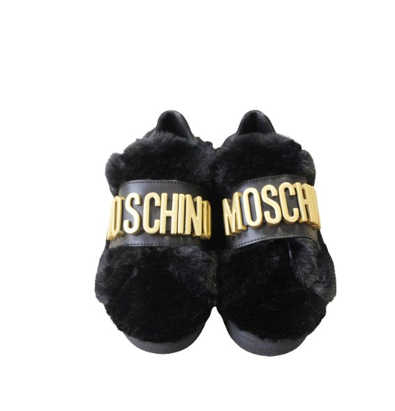 Moschino sneakers with gold metal logo on the strap.