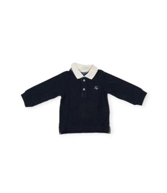 Cotton pique polo shirt with long sleeves, front button placket. Ribbed collar and cuffs. Embroidered logo on the front.