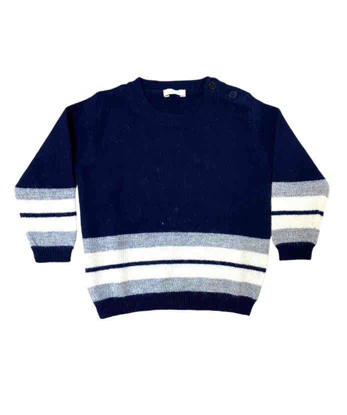 Crew neck wool sweater, with button fastening on the shoulder, contrasting coloured inserts.