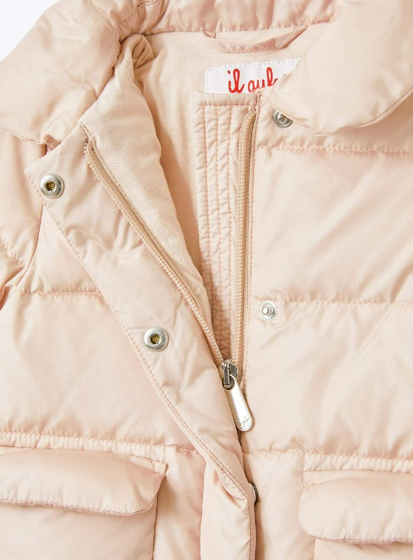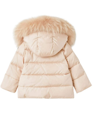 Baby jacket, zip and clip fastening, patch pockets, hood and removable fur.