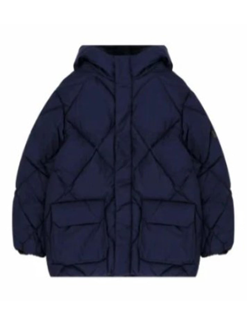 Quilted jacket, patch pockets with flap, zip and clip fastening, fixed hood.