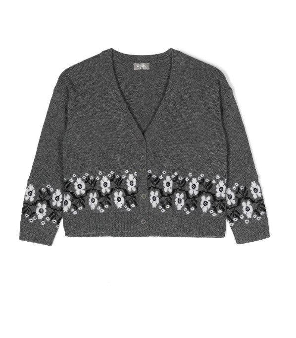 Wool cardigan sweater with V-neck, front button fastening, embroidery on the hem and sleeves.