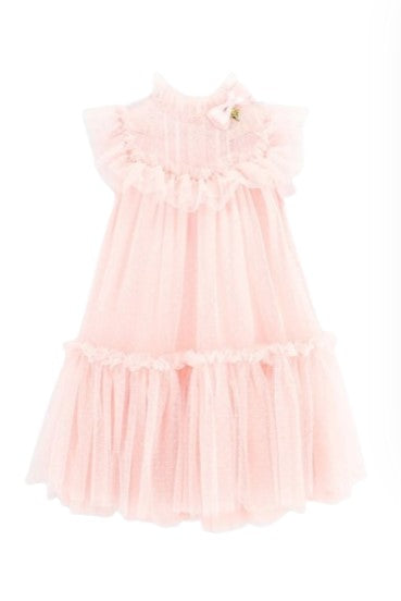 Pink polka dot tulle dress with yoke made of tucks and sweetheart lace. Ruffled collar with bow and pendant. Closure on the back with gold button.