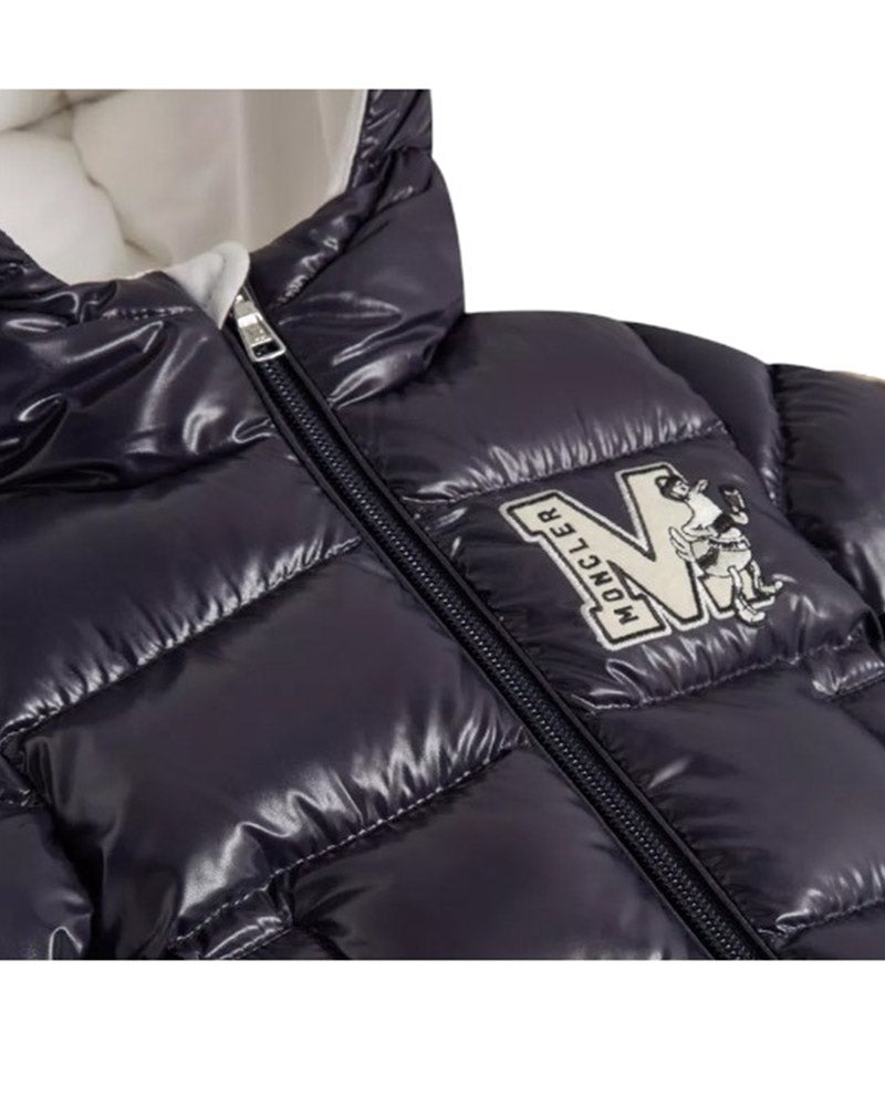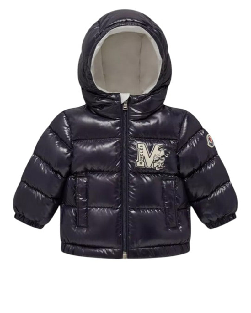 Quilted jacket in nylon laqué with fixed hood, zip fastening, welt pockets, elasticated cuffs, embroidered monogram.