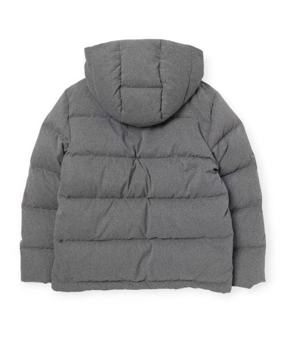 Children's quilted jacket with fixed hood, front zip fastening, side American pockets with zip.