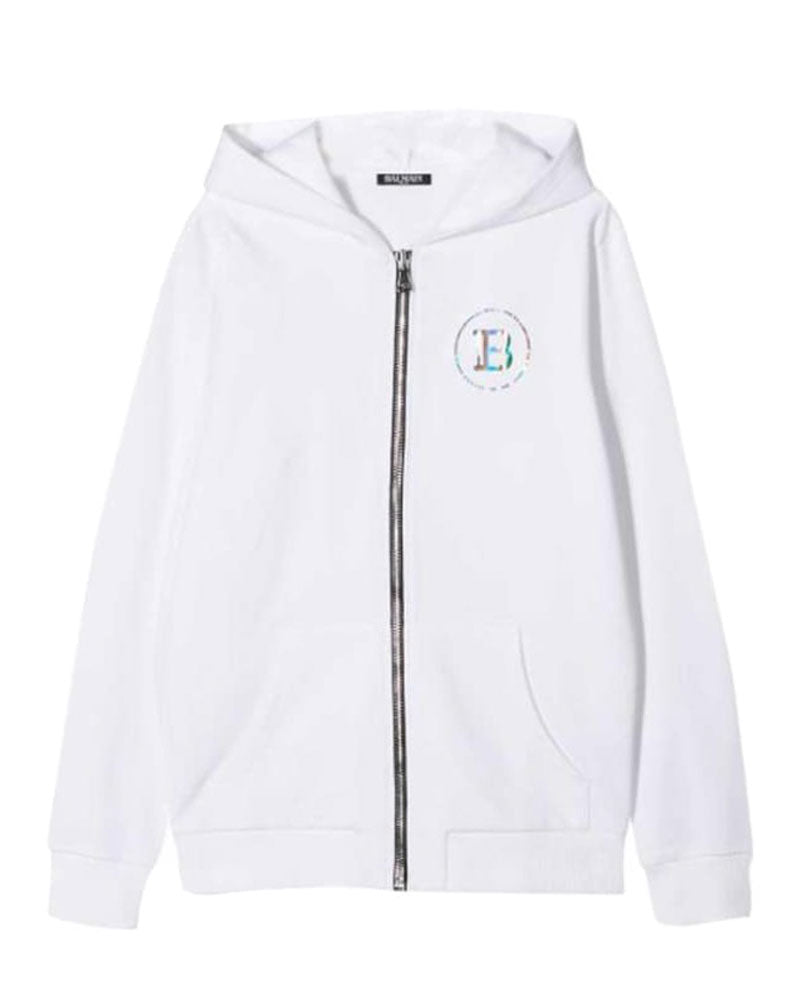 Felpa Balmain in cotone con cappuccio, stampa logo multicolore sul petto e dietro, chiusura con zip, due tasche aperte.