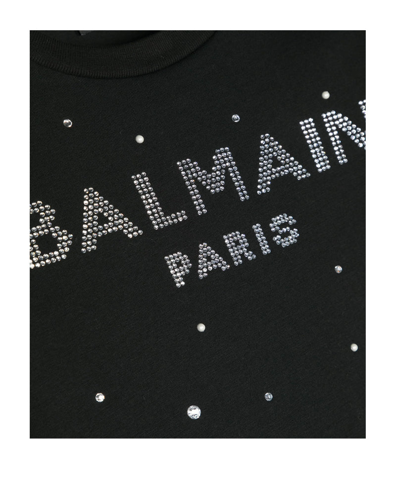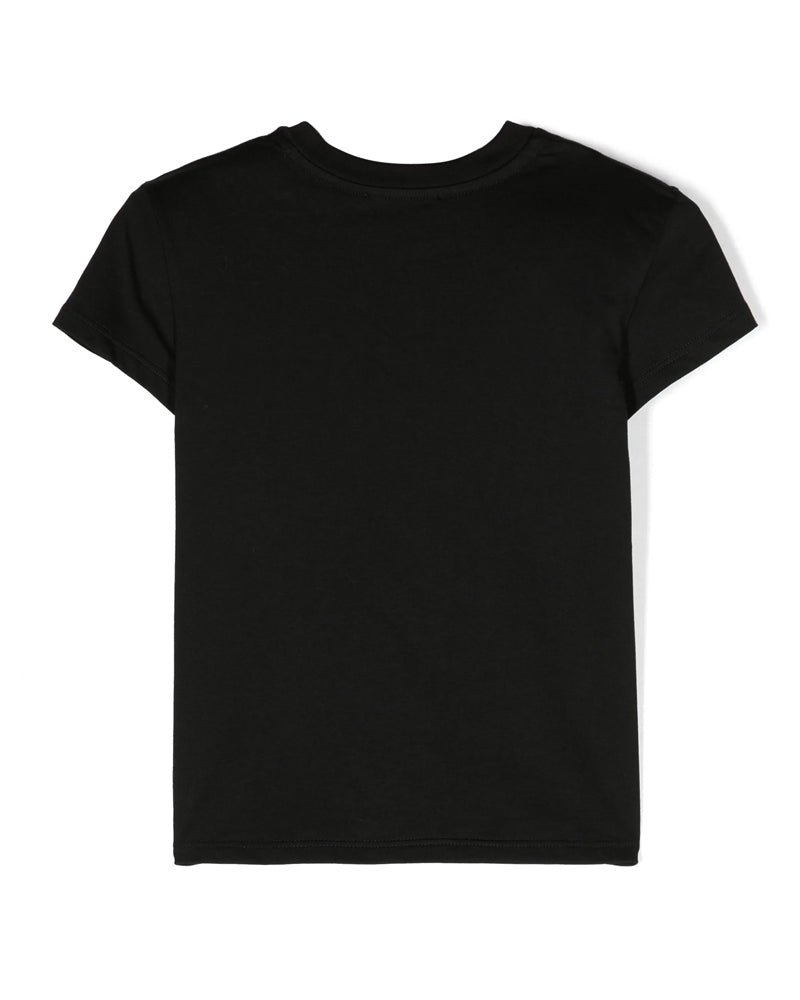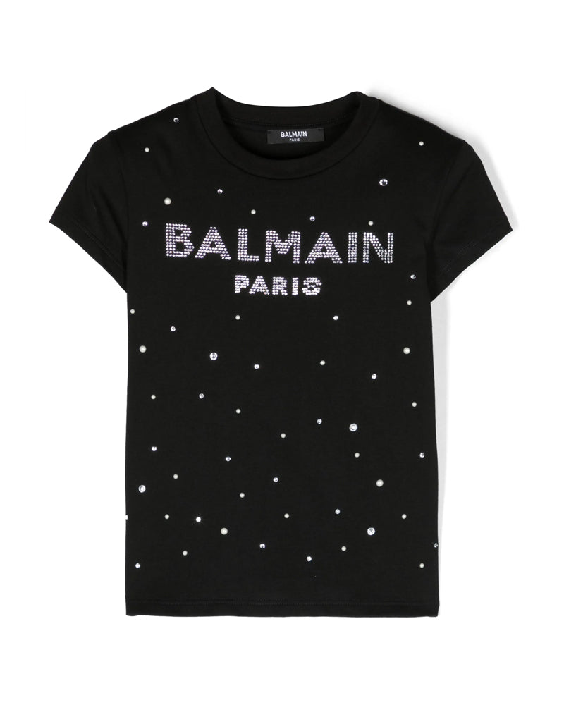 T-shirt con decorazione di strass e perle sintetiche. Presenta logo frontale con strass, girocollo, maniche corte e orlo dritto.