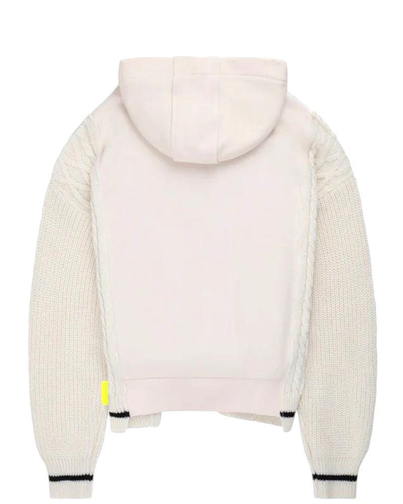 Felpa avorio bi-tessuto realizzata in cotone garzato. Presenta cappuccio, fodera in pile, maniche lunghe realizzate in lana con motivo a treccia e orlo asimmetrico. È decorata con stampa Smile e logo sulla parte anteriore.