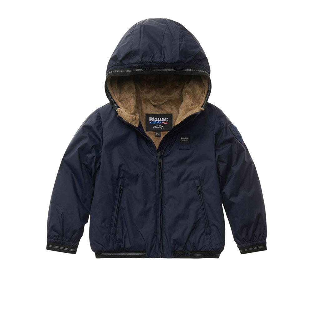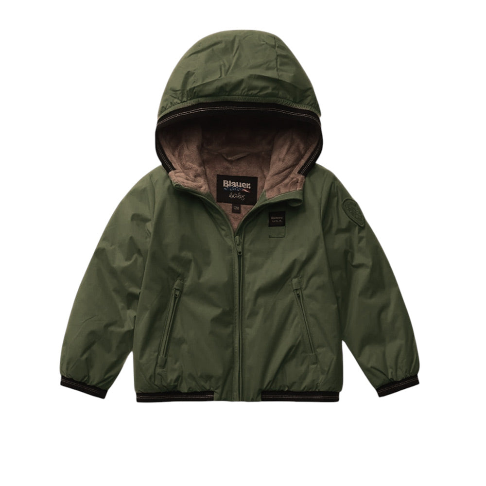 Smooth baby jacket with soft and warm faux fur inside, fixed hood with striped elastic, made of nylon, padded with light wadding and lined in faux fur for enveloping comfort, invisible zip closure and slider cover on the neck for greater protection, pockets with invisible zip for a clean and practical design, striped elastic on the bottom and cuffs for a perfect fit, patch and loop with logo for a distinctive touch of style.