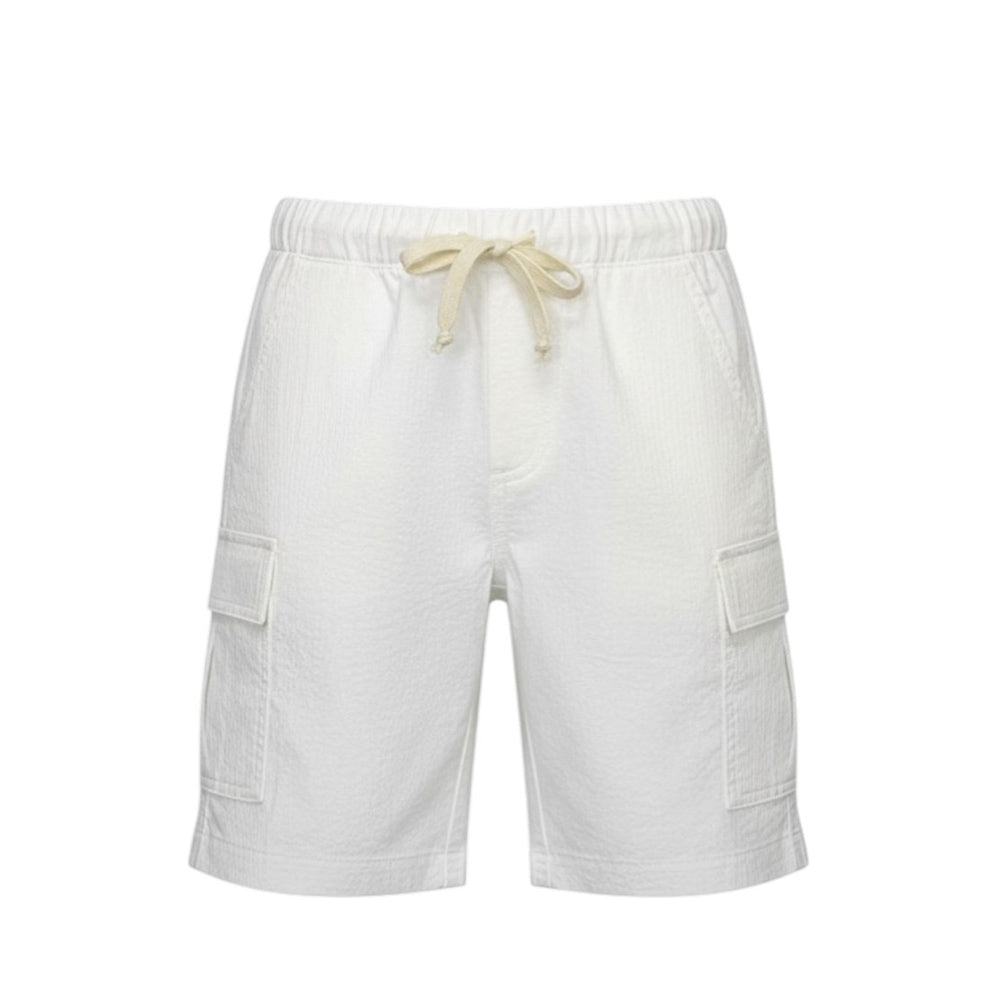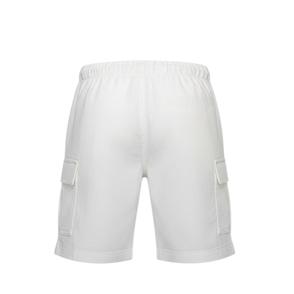 Bermuda cargo per bambino, realizzato in cotone effetto goffrato. Presenta vita elasticizzata con coulisse, due tasche laterali all'americana e due tasche cargo applicate sui lati.