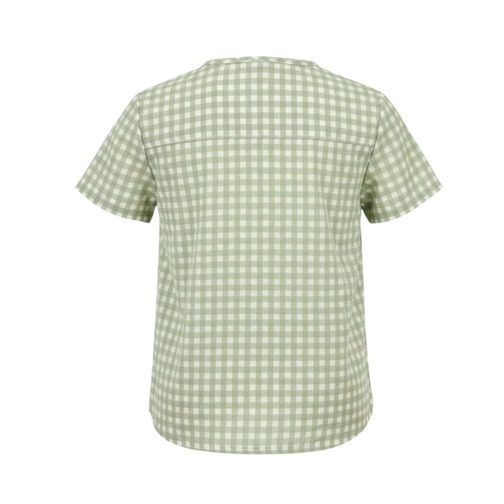 Camicia a quadri per bambino, realizzata in misto cotone. Presenta scollo tondo, maniche corte, chiusura con bottoncino sul davanti, una tasca a filetto sul petto e orlo dritto.