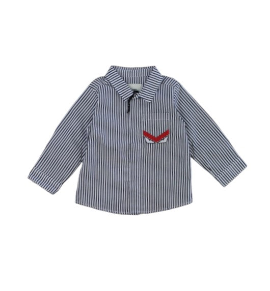 Long-sleeved baby shirt with classic collar. Striped pattern, embroidered chest pocket. Front button closure.