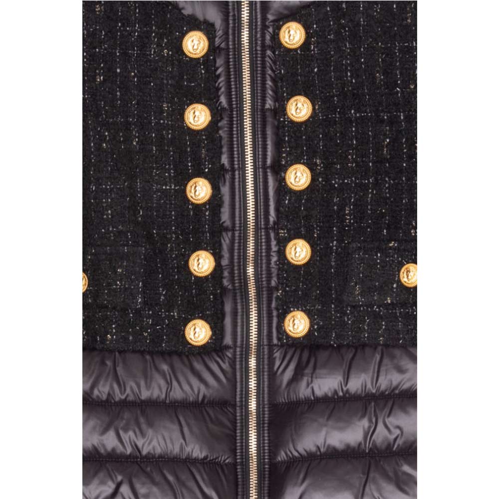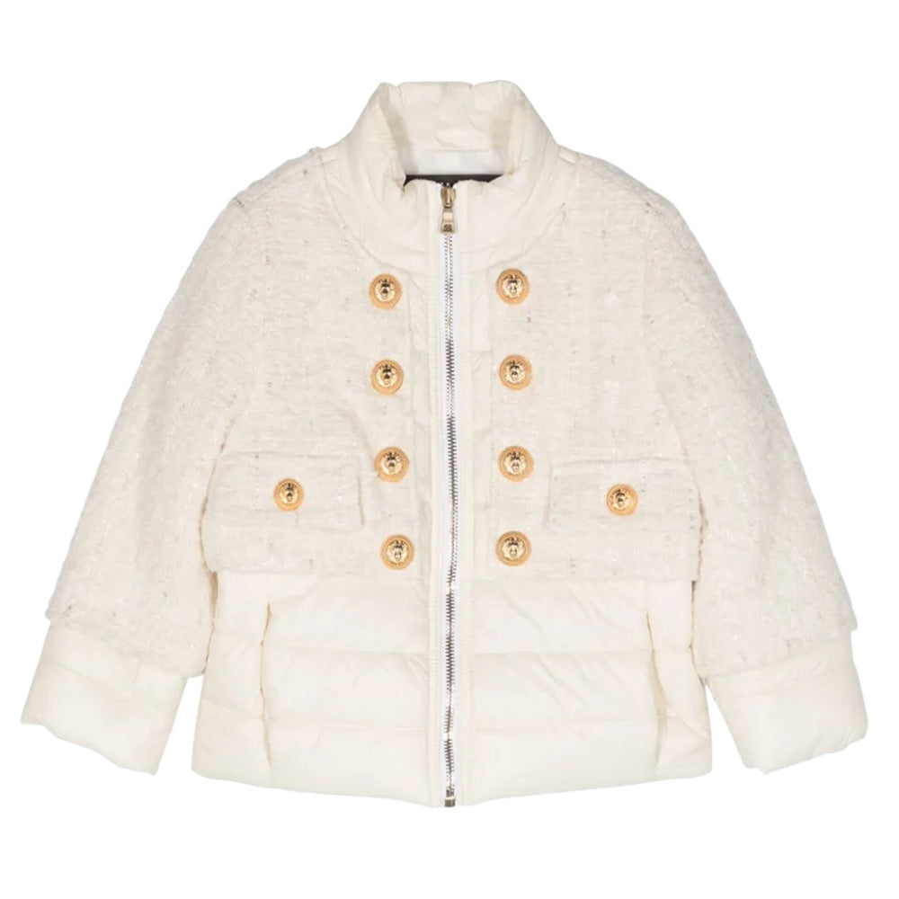 Gorgeous Balmain double-fabric jacket, perfect for your little girl! With jeweled buttons on the front, it will add a touch of elegance and style to every look. Keep her warm and fashionable with this unique piece.