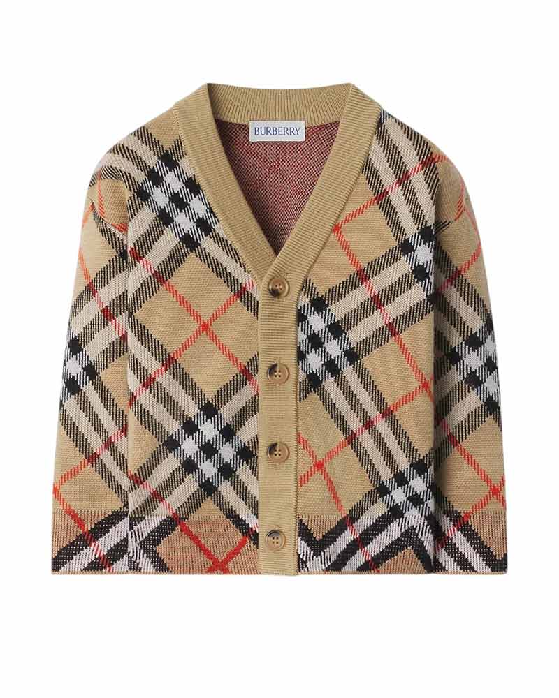 Cardigan in lana con iconica fantasia Burberry Check in jacquard, caratterizzato da scollo a V, maniche lunghe, chiusura frontale con bottoncini e finiture a costine.