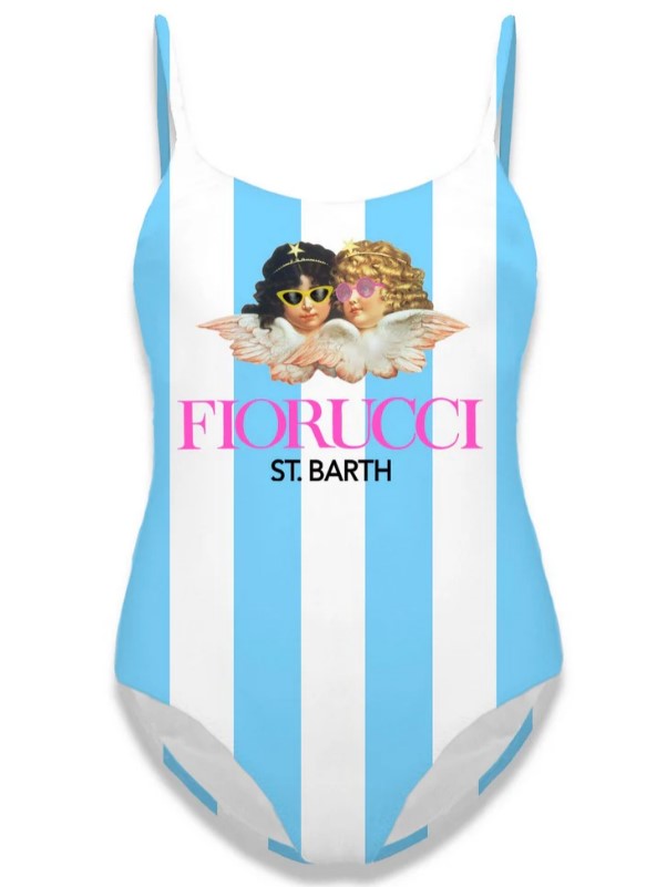One-piece girl's swimsuit with all-over striped pattern and Fiorucci print on the front. Adjustable shoulder straps.
