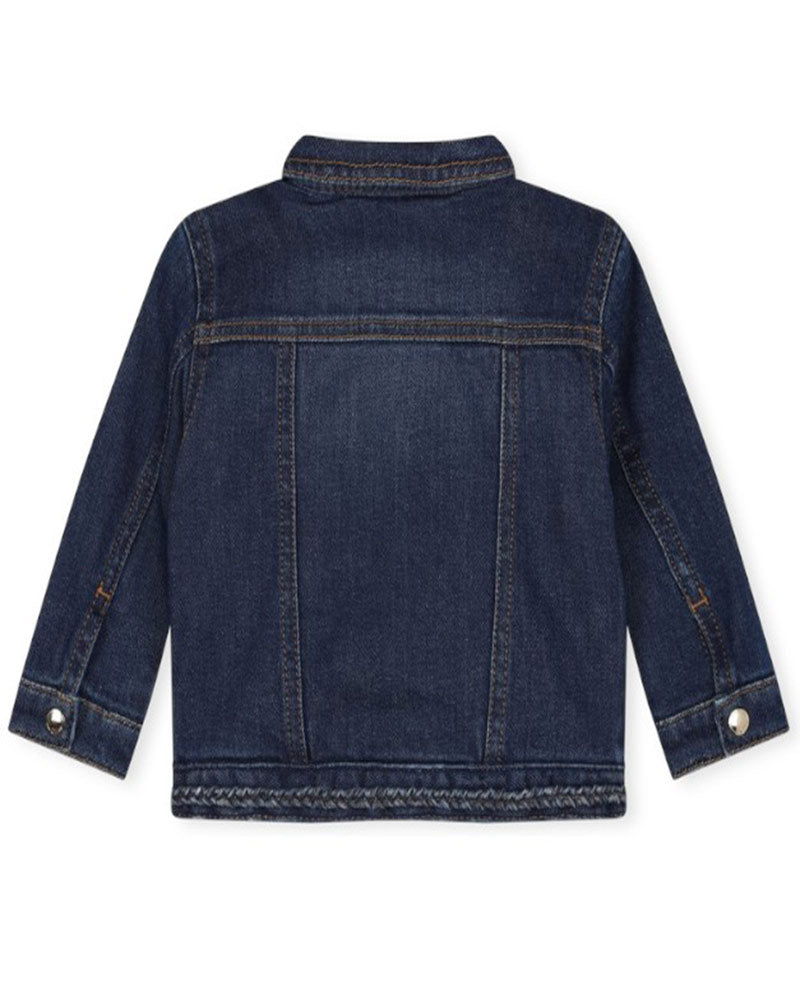 Giubbino da neonata realizzato in denim di cotone. Presenta coletto a punta, chiusura frontale con bottoncini a pressione, maniche lunghe e fodera realizzata in morbido pile. È decorato con due taschine con patta applicate sul petto e logo ricamato.