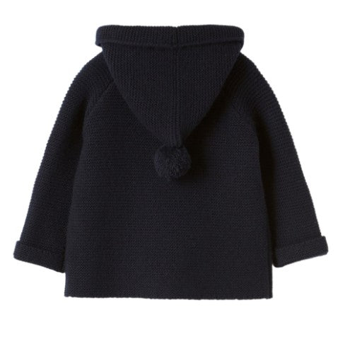 Wool cardigan sweater, double-breasted, with hood and patch pockets, button fastening, patch pockets.