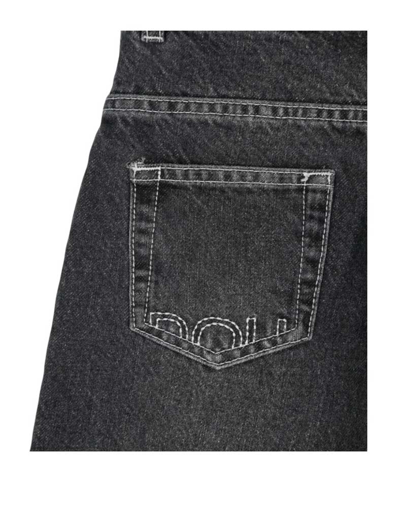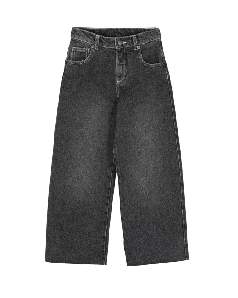 Jeans neri a palazzo da bambina, realizzati in denim di cotone. Presentano chiusura frontale con zip e bottone, passanti per cintura e logo ricamato sul retro.