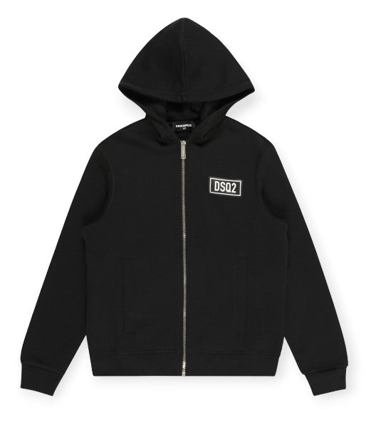 Zip-up hoodie, contrasting logo printed on the front, welt pockets.