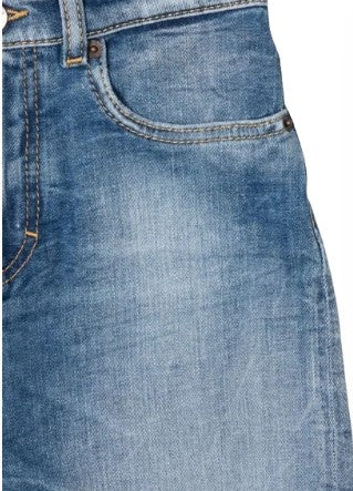 Stretch denim jeans, five-pocket style, front button and zip fastening. Logo label on the flap.