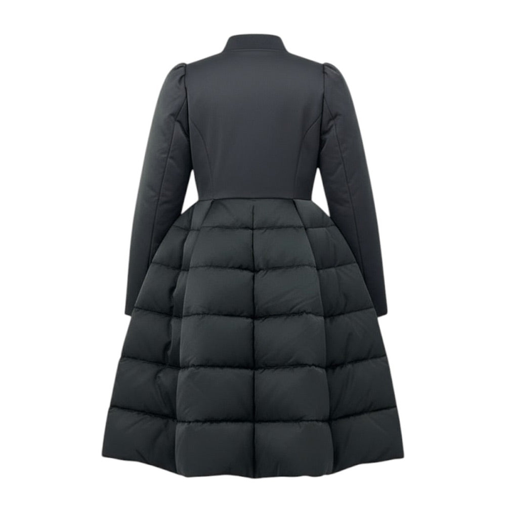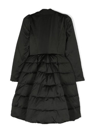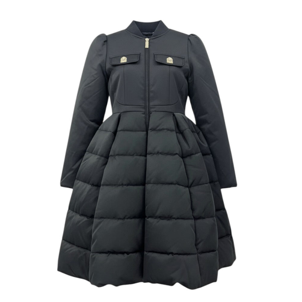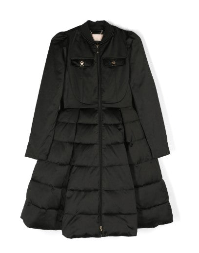 Long quilted jacket, zip fastening, front patch pockets with logo buttons.