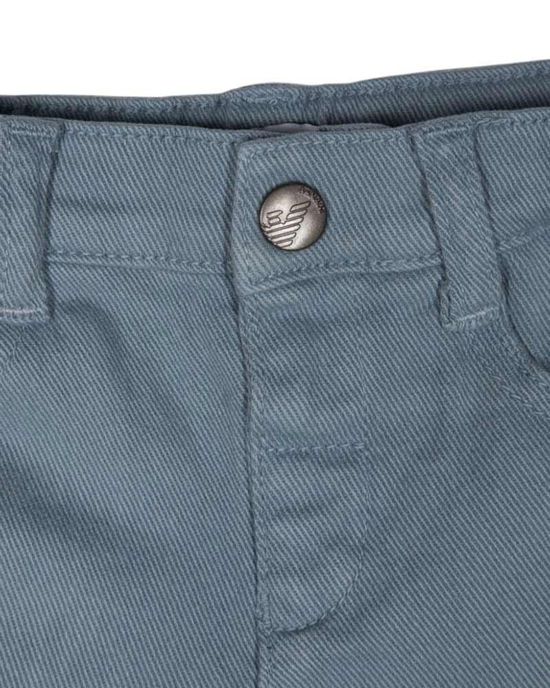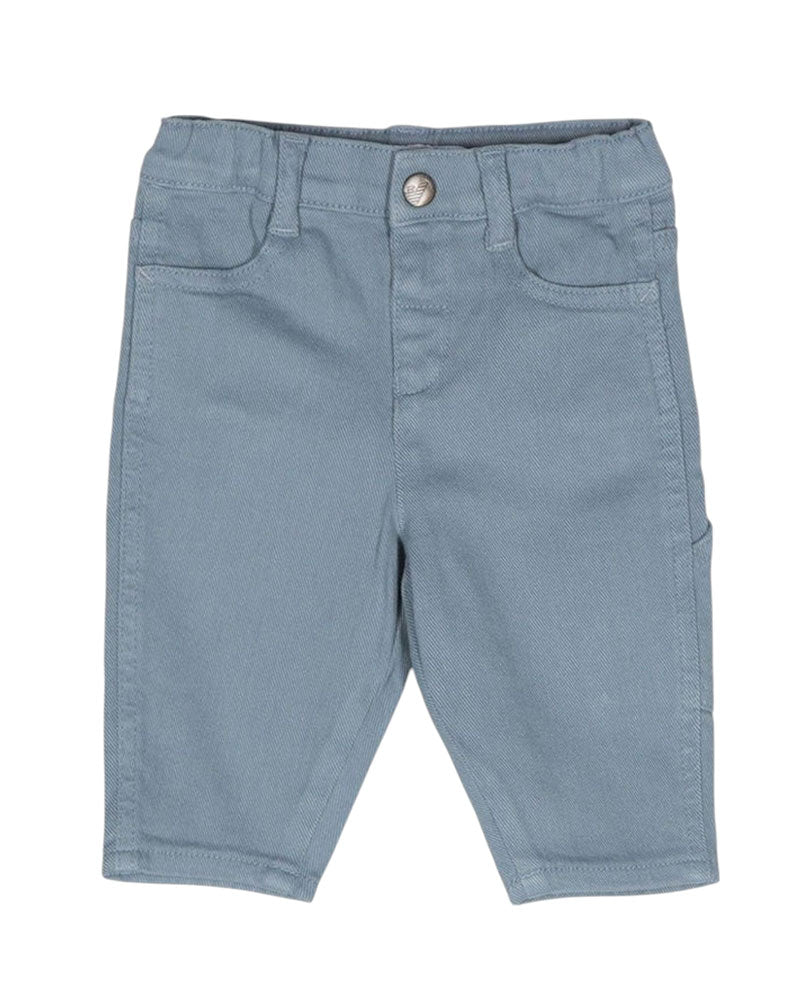Pantaloni realizzati in denim di cotone, modello cinque tasche. Presentano chiusura frontale con bottoncino a pressione, vita regolabile grazie ad elastico interno con bottoni, passanti per cintura. Sono decorati con placca logo applicata sul retro.