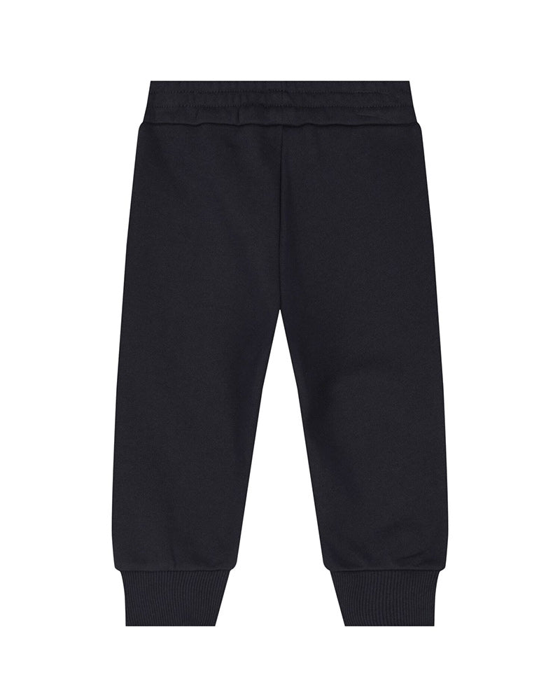 Pantaloni jogger blu navy da neonato, realizzati in felpa di cotone. Presentano vita elasticizzata, tasca a marsupio sul davanti e fondo con elastico alla caviglia. Sono decorati con patch logo applicata sul davanti.