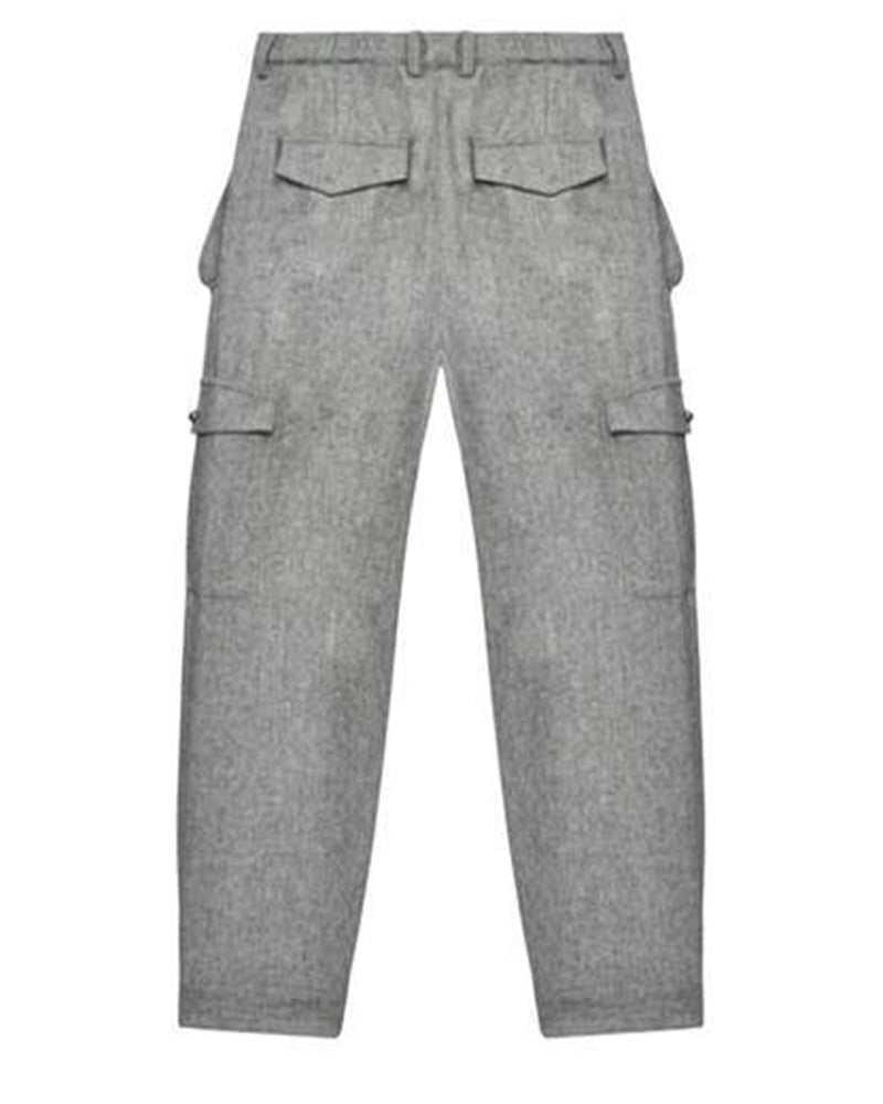 Pantaloni cargo realizzati in misto lana da bambina. Presentano vita elasticizzata sul retro, chiusura frontale con botton e zip, due tasche applicate sul davanti, due tasche cargo ai lati e due tasche decorative con patta sul retro.