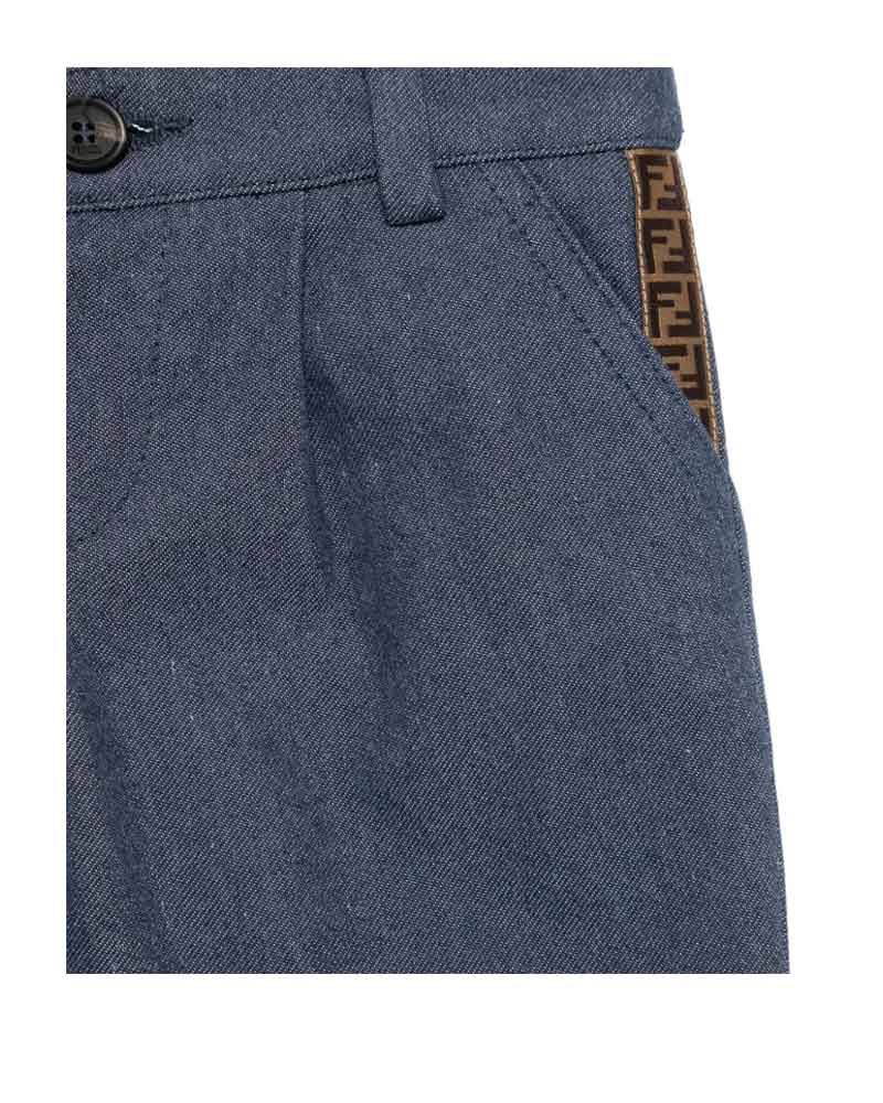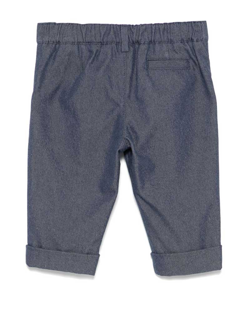 Pantalone da neonato in denim di cotone con risvolto Fendi Kids. Presenta vita elasticizzata sul retro, chiusura frontale con bottone, passanti per cintura, sue tasche laterali con inserti logo FF.