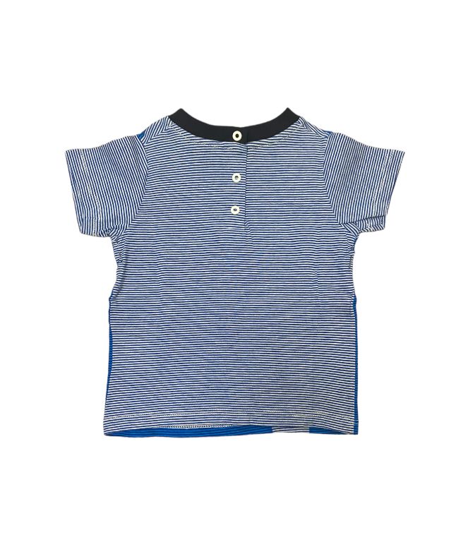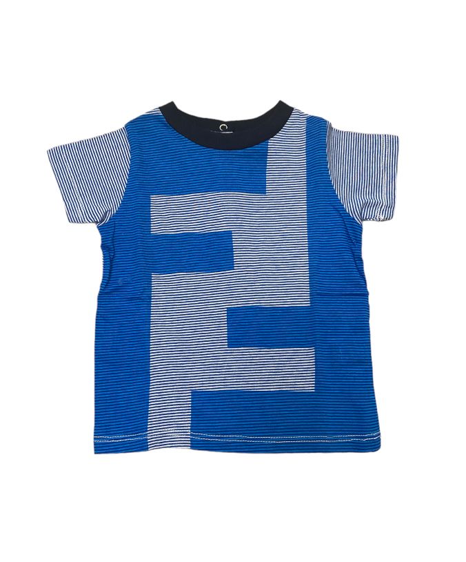 Crew neck short sleeve T-shirt, striped pattern, logo printed on the front. Closure clips on the back.