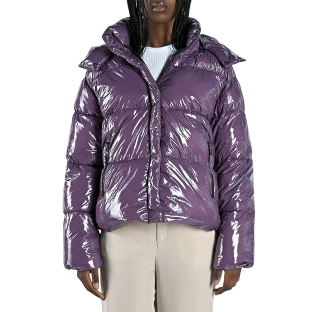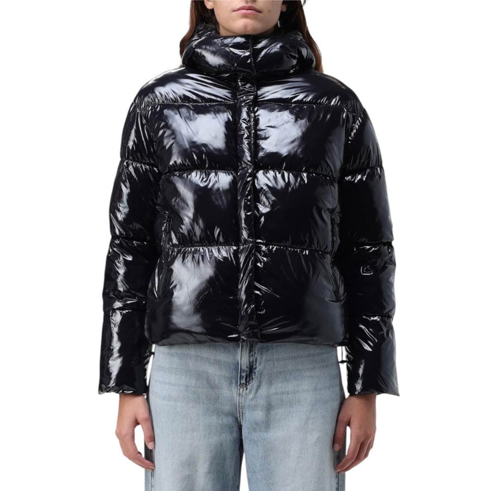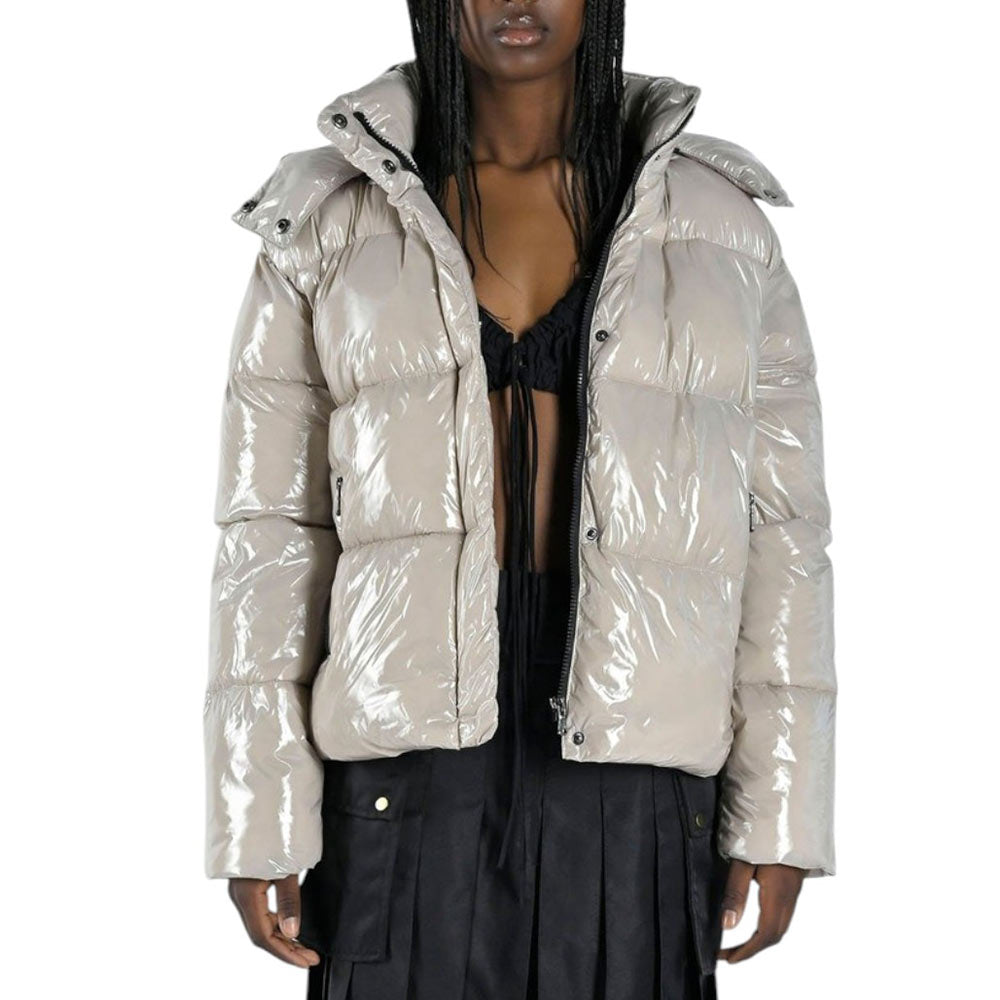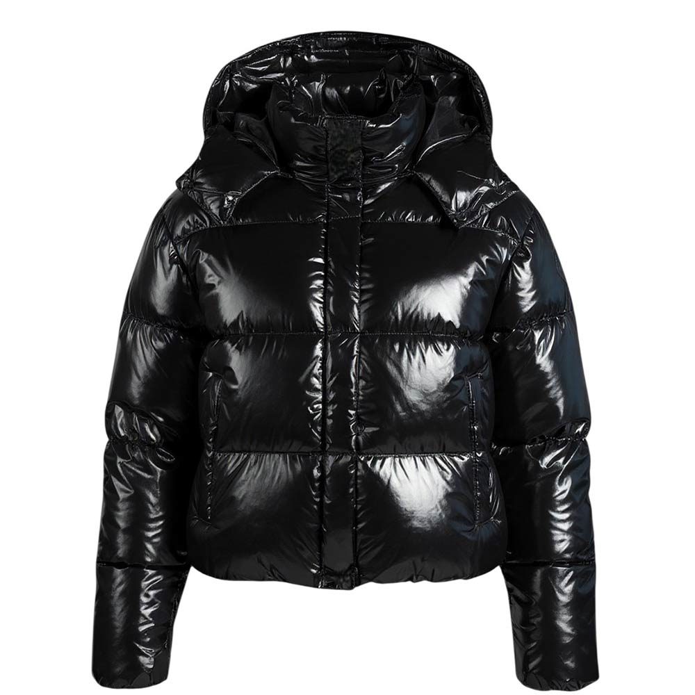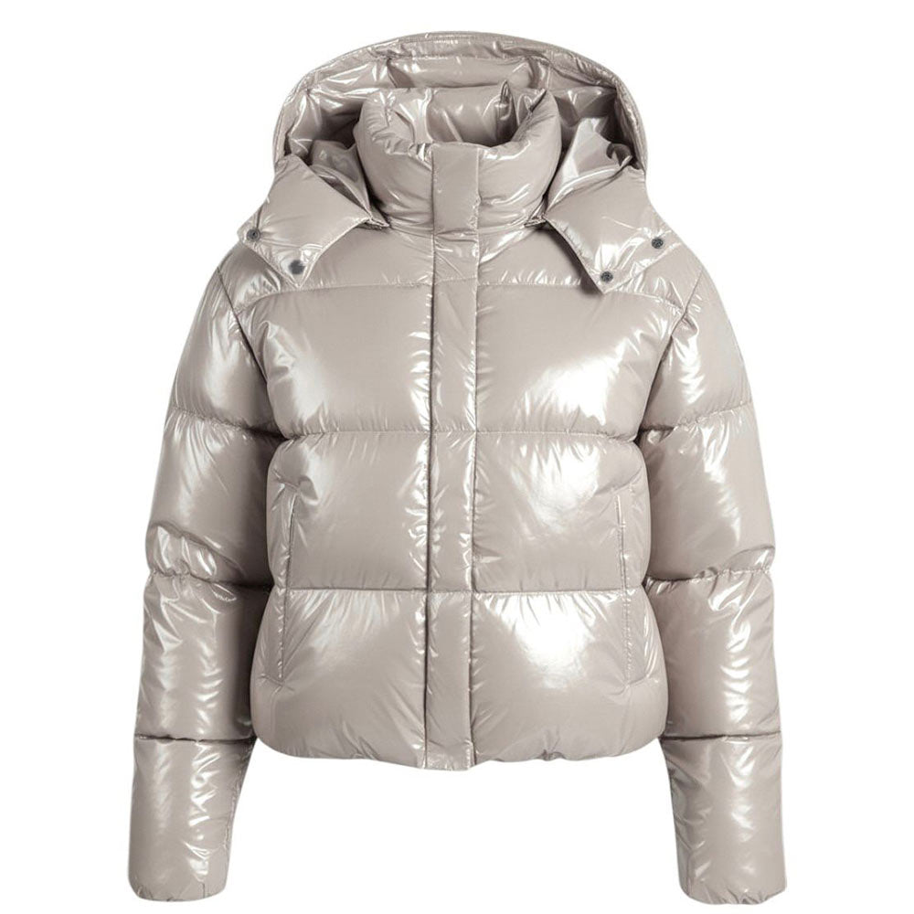 Quilted jacket in waterproof fabric, straight model, removable hood, zip fastening, side pockets with zip, drawstring at the hem.