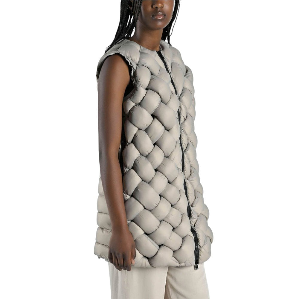 Padded vest, woven design, high collar, double-slider zip front closure, sleeveless and straight hem.
