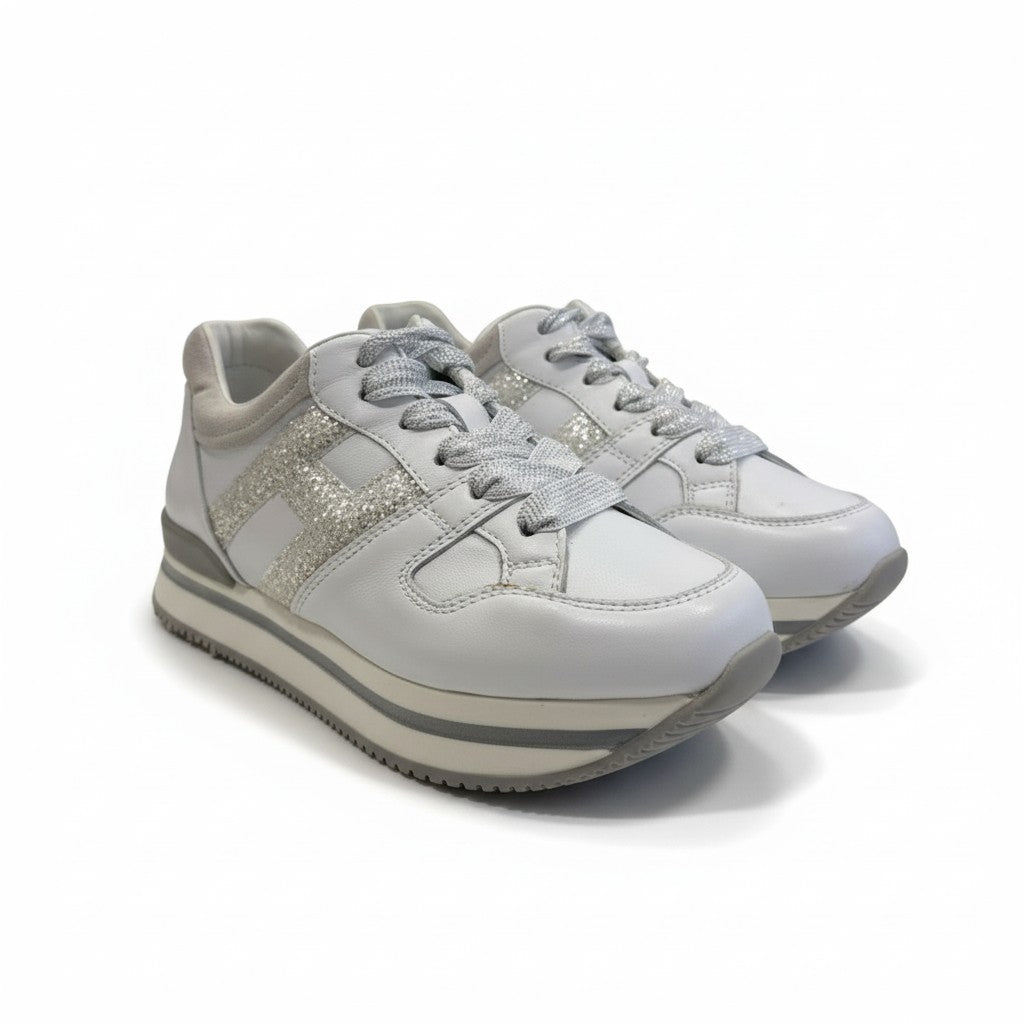 Realizzate in morbida pelle bianca, queste sneakers presenta la caratteristica “H” laterale arricchita da un elegante inserto in glitter. La suola in gomma ultraleggera assicura un comfort ottimale e una calzata piacevole per tutto il giorno.